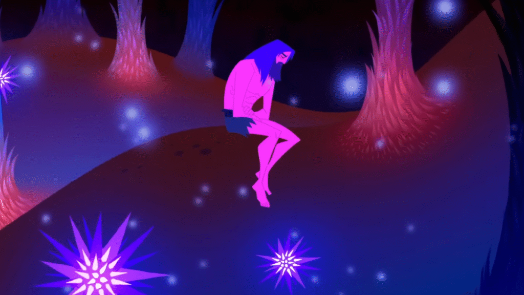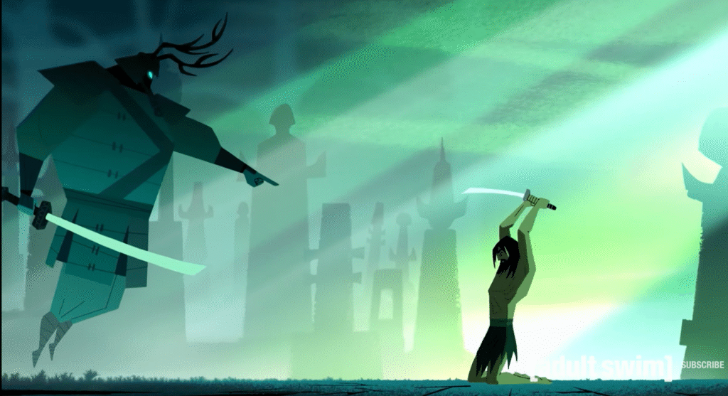 If hope sprouts from the choice to live, Samurai Jack shows that it endures only when the self learns to live with despair—through discipline that brings one’s emotion into balance. Season 5 often deliberately slows its pacing to fix the audience’s focus on Jack’s struggle with despair. In scenes where he sits in silence amongst flora or argues with his demons, cinematic choices like long pauses, haunting echoing sound design and the lack of background music stretch each moment of failure into reflection.