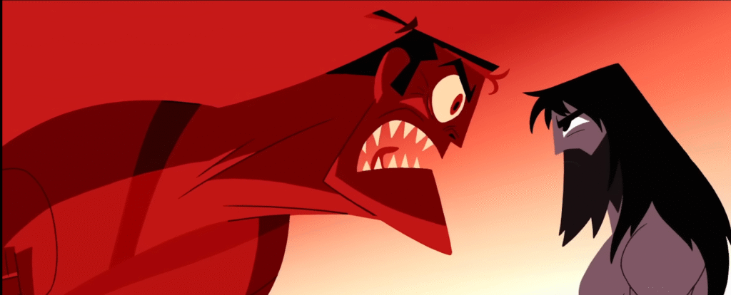 Season 5’s figures—Aku, the Omen and Ashi—function less as plot devices than as mirrors of Jack’s internal states of turmoil and triumph. This guides the audience through the cycle where hope declines, endures and is renewed. Aku, the shapeshifting demon, represents entropy, time’s paralysis that halts Jack’s progress, a key driver for his depression. The Omen externalises Jack’s guilt, confronting him with the fear that his purpose is lost.
