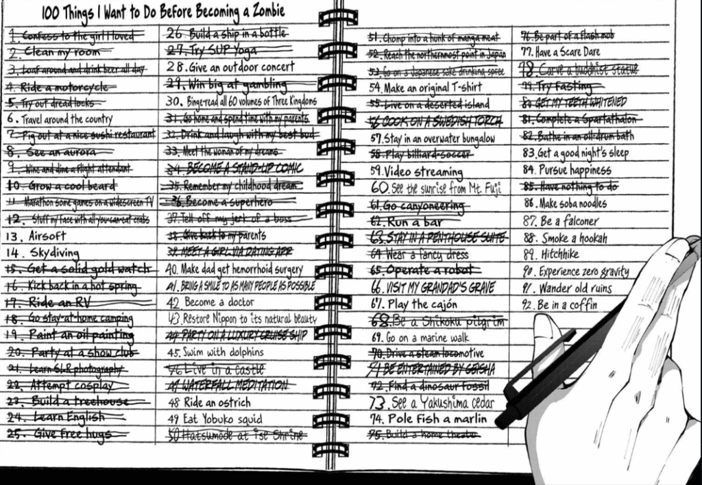 Akira's bucketlist notebook (Image from u/GeneralMedia8689, 2023, r/Zombie100, linked here)